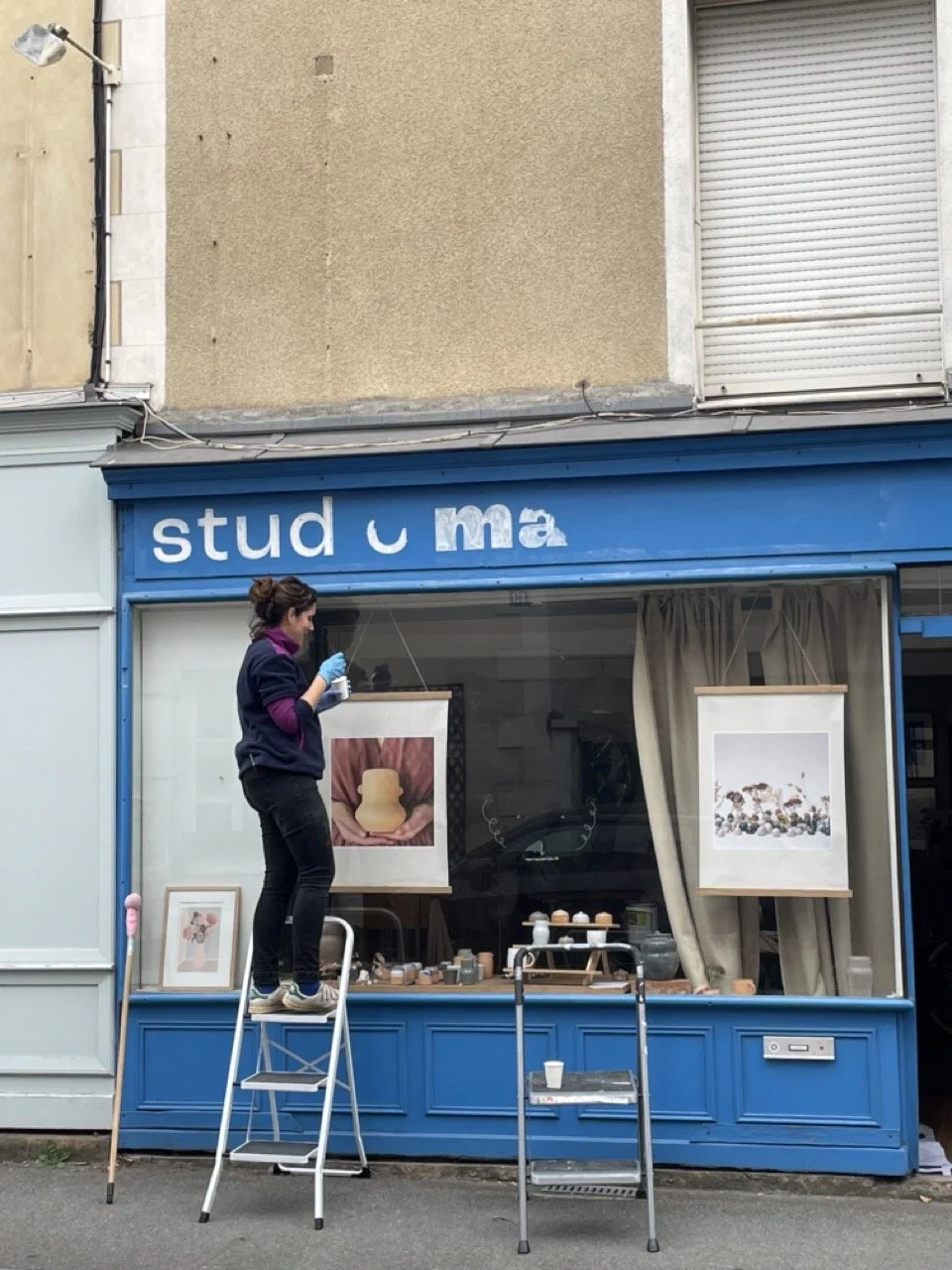 J’ai d’ailleurs abandonné … je devrais repasser une couche finale, mais je ferais ça plutôt aux beaux jours. Comme il à plu j’ai rangé le matériel et je me connais … maintenant qu’on lit “studio matières” au loin c’est mieux que de ne pas avoir d’enseigne. Mon amoureux est venu me filer un petit coup de main, mais ayant d’autre priorité - sans dec - ce travail restera inachevé pour le moment. Et en plus … je trouve que j’ai mis le lettrage un poil un peu trop haut hahah !